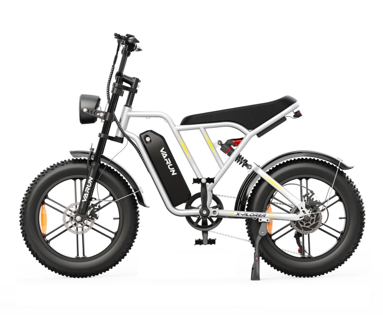 Comfort plays a major role in the X-Plorer’s design. The bike includes a full-suspension system for smooth and stable rides. Both front and rear shock absorbers reduce bumps and vibrations. This feature minimizes fatigue during long trips on rough terrain. Riders feel steady and balanced on gravel roads, dirt paths, or uneven city surfaces.